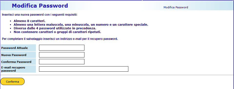 Nuova password e Conferma Nuova Password: devono essere uguali e rispettare i seguenti requisiti: